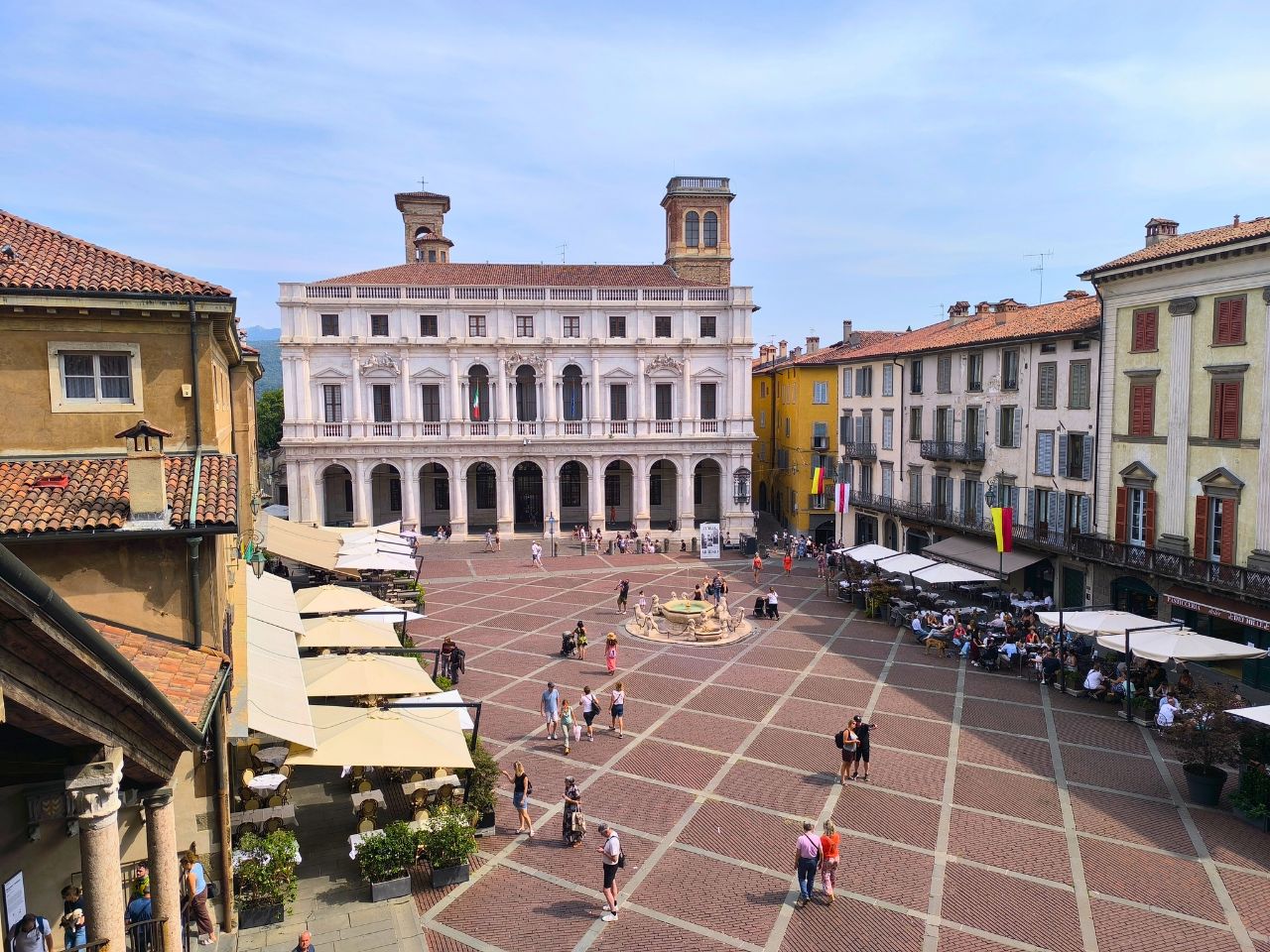 Das Herzstück der Altstadt ist die Piazza Vecchia mit ihrem eleganten Brunnen, dem Palazzo della Ragione und der stimmungsvollen Atmosphäre. Ein echtes Fotomotiv – besonders von oben.