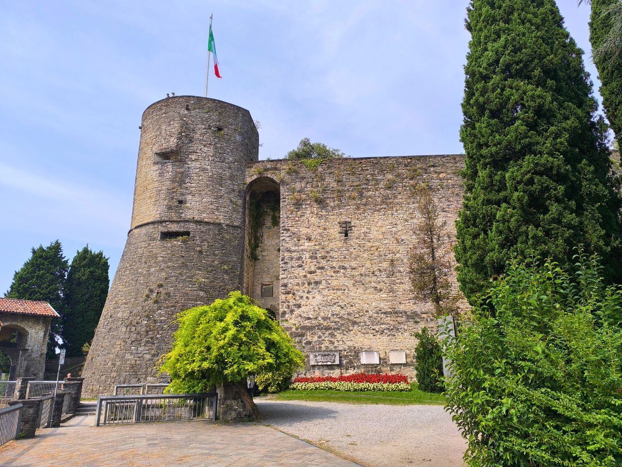 Starte deinen Rundgang bei der Rocca di Bergamo, einer historisch mittelalterliche Festungsanlage auf einem Hügel mit herrlichem Ausblick auf die Alt- und Neustadt. Ein Spaziergang um die Anlage lohnt sich unbedingt: Rundwege, kleine Grünflächen und wechselnde Perspektiven machen diesen Ort zu einem der besten Aussichtspunkte der Stadt.