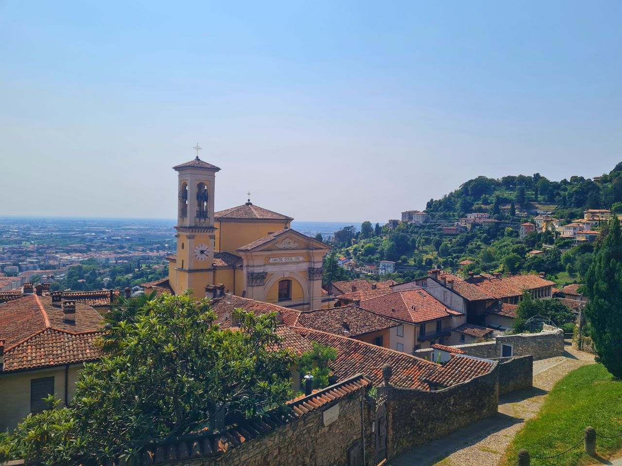 Oben erwarten dich ruhige Aussichtspunkte und kleine Spazierwege – perfekt, um die Città Alta aus der Vogelperspektive zu genießen. Besonders lohnend ist es, den Rückweg zu Fuß anzutreten: Auf dem Abstieg hast du immer wieder tolle Blicke auf Bergamos Altstadt und die umliegende Hügellandschaft.