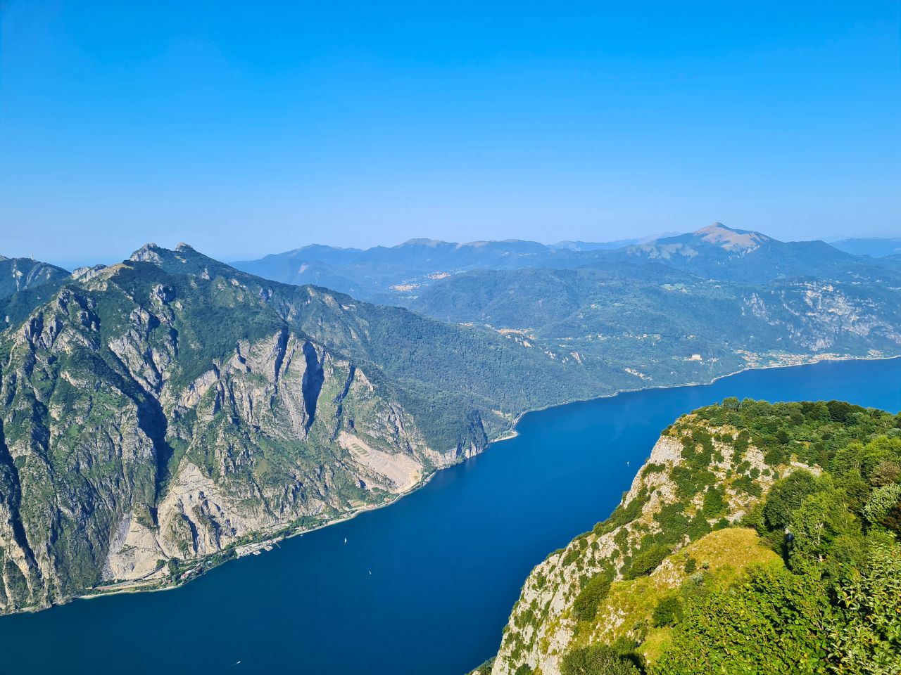 Oben angekommen, erwartet dich eine alpine Welt mit klarer Luft, grünen Wiesen und zahlreichen Wanderwegen. Besonders empfehlenswert ist der kurze Aufstieg zum Punto Panoramico, Piani d’Erna. Ab der Bergstation folgst du dem Schild zum “Punto panoramico” bergauf – nach 15–20 min erreichst du ein Gipfelkreuz, mehrere Plattformen und fantastische Fotospots. Der Blick reicht weit über den Comer See bis zu den Alpen.